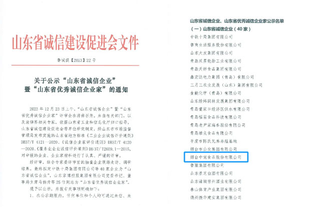 2023 年,中宠股份持续前进,接连揽获多项省市级和国家级荣誉:2023 年度国家知识产权示范企业、山东省“十强”产业集群领军企业、宠物食品企业科技创新奖、山东省诚信企业荣誉称号,企业实力及社会贡献收获来自政府及社会各界的高度认可。