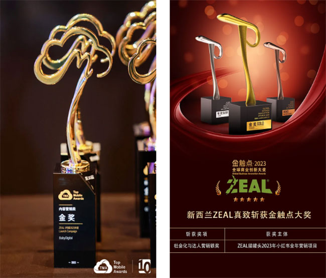 营销方面,凭借优秀的品牌影响力,ZEAL0号罐 2023 年度Launch Campaign成功被评为第 10 届TMA大奖内容营销类金奖,ZEAL猫罐头 2023 年小红书全年营销项目也成功获得 2023 金触点大奖·社会化与达人营销银奖,成为推动品牌营销新发展的典型案例。