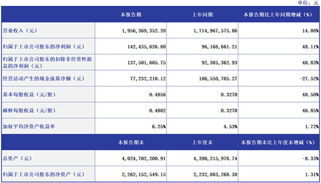 报告期内,公司实现营业收入19.56亿元,同比增长14.08%;归属于上市公司股东的净利润为1.42亿元,同比增长48.11%。2024年第二季度的营收和净利润均达到了公司上市以来的最高季度水平。
