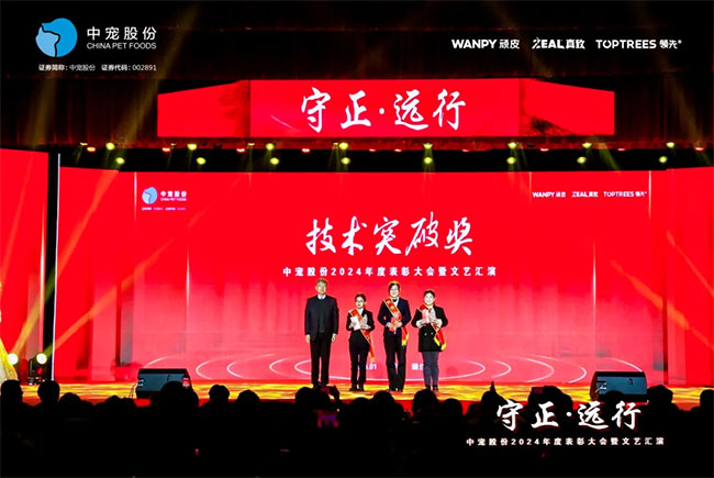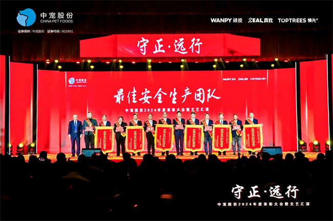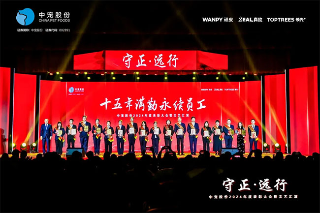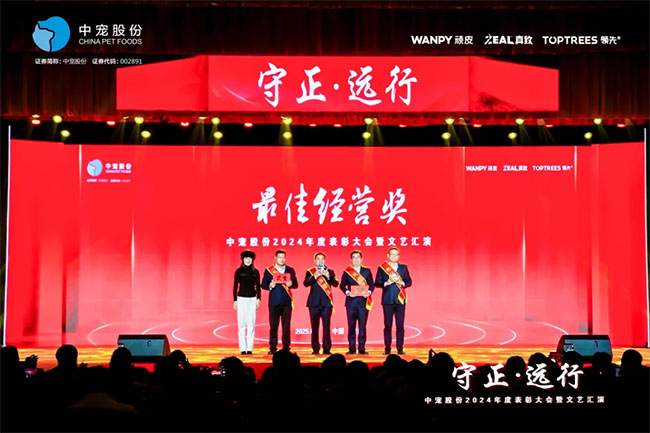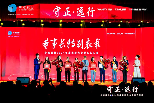 在这充满荣耀与激情的时刻,我们齐聚一堂,共同见证那些在2024年里为中宠股份做出卓越贡献的个人与团队。他们在各自的岗位上拼搏奋进,用实际行动诠释着责任与担当,推动公司不断迈向新高峰,书写着属于中宠股份的辉煌篇章。董事长特别表彰奖的卓越经营贡献;最佳销售团队的攻坚克难、披荆斩棘;中宠新锐奖获得者的奋发进取与朝气蓬勃;海外开拓先锋的勇毅担当;金牌销售奖的奋发与卓越;满勤永续的坚韧与执着;最佳支持团队的默默奉献与坚实后盾;最佳协同奖与最佳项目奖的团队协作与创新突破……他们共同书写了中宠股份27年的辉煌历史,以实际行动传承和弘扬着中宠股份的企业文化,用无畏与拼搏展现着中宠股份品牌的精神力量!