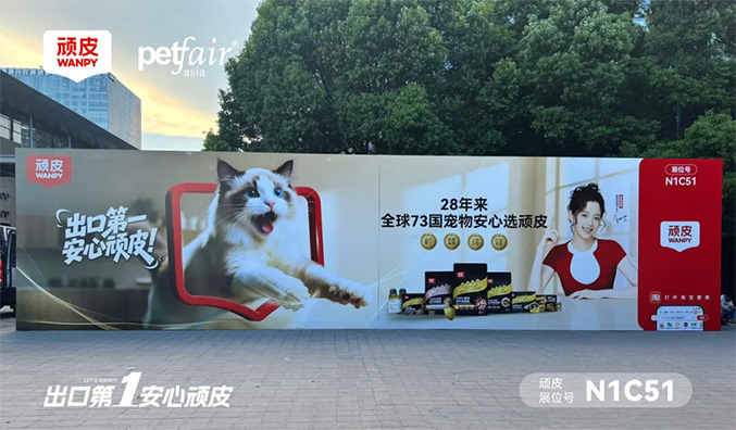 本届亚宠展,WANPY顽皮®以“出口第一,安心顽皮”为主题高光亮相。展台整体视觉突出“世界品质、上市公司、行业龙头”的品牌背书,围绕明星单品顽皮小金盾 100% 鲜肉全价成猫粮,通过干粮、湿粮、零食全系产品展示,全面呈现“出口第一”的综合实力。