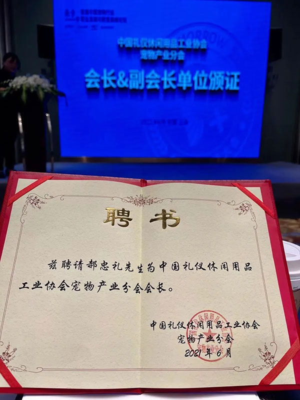 6月28日下午,中国礼仪休闲用品工业协会宠物产业分会(以下简称“CGLA宠物产业分会”)在上海正式成立。中宠股份董事长郝忠礼当选CGLA宠物产业分会会长并作就职讲话。