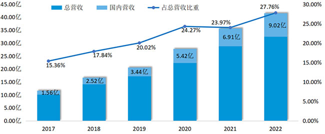 再看国内市场,聚焦战略下,中宠股份国内市场营收份额高速增长,从2017年的1.56亿元,已经发展到2022年的9.02亿元,业绩占比也在不断攀升,从2017年的15.36%提升至2022年的27.76%。