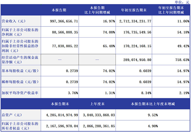 其中,第三季度营收9.97亿元,同比增长16.97%;归母净利润8056.69万元,同比增长74.08%;基本每股收益0.2739元,同比增长74.02%。