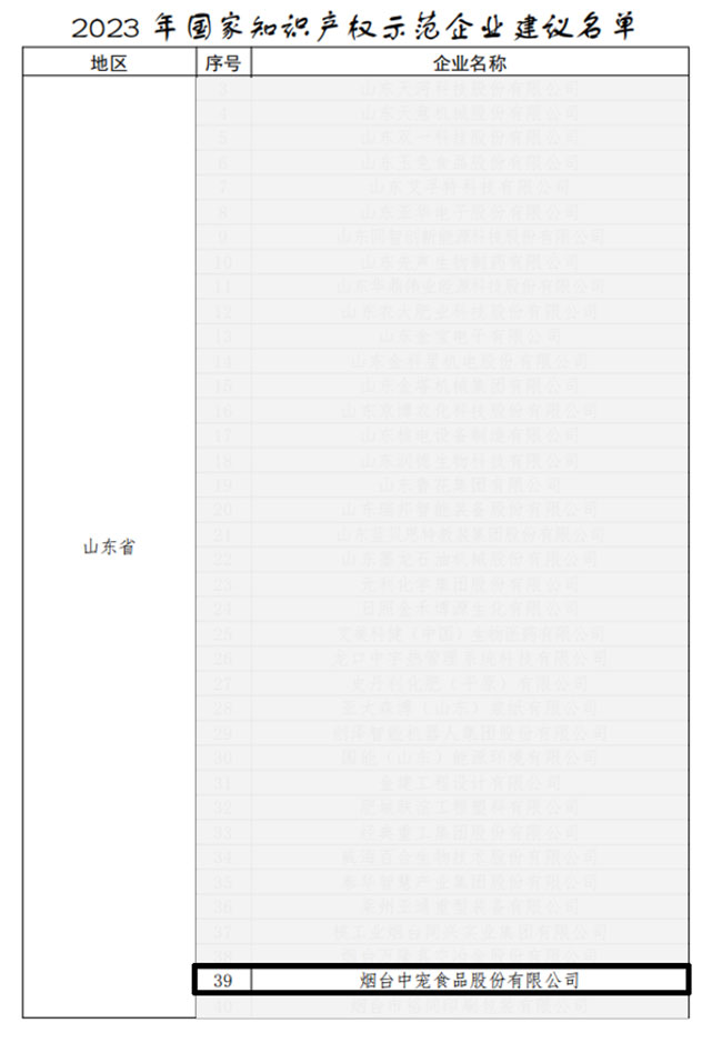 为了提升企业知识产权竞争力和转化运用效益,推动实体经济高质量发展,国家知识产权局于2023年启动了面向企业的知识产权强国建设示范工作。经过企业自评、推荐上报、审核确认等程序,近日,国家知识产权局网站正式发布“关于2023年度国家知识产权优势企业和示范企业评定结果的公示”,烟台CQ9电子官方版股份有限公司(以下简称“中宠股份”,证券代码:002891)光荣上榜,成功获评“国家知识产权示范企业”荣誉称号,成为中国宠物食品行业首家获得此项荣誉的企业。