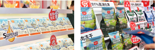 此外,wanpy顽皮®品牌两款新品也在本届它博会上首发亮相。在主食级营养配方的基础上,wanpy顽皮®欧一吸鱼油猫条特别甄选了来自冰岛的高品质鱼油,一支即可满足猫咪每日Ω-3营养需求;在紧邻的陈列货架上,无谷护肠胃、一口两种肉的wanpy顽皮®双鲜4.0系列干粮惊喜展出。经历多轮迭代更新,双鲜4.0系列干粮在市场的声音中持续提升产品品质,以焕新的面貌再度面向市场。