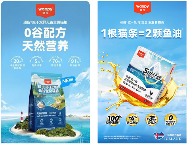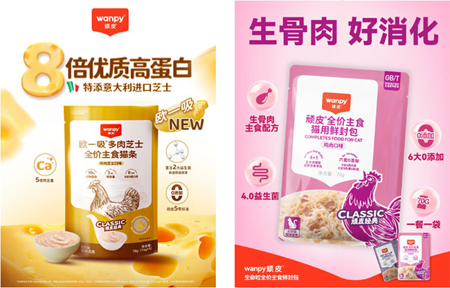 产品方面,wanpy顽皮®品牌坚持“创新”“关爱”“有趣”的产品创新理念,持续发挥主粮优势,旗下热门干粮产品“双鲜系列干粮”迎来重磅升级,多渠道持续热销。不仅如此,wanpy顽皮®旗下多款经典产品也迎来了主食方向新升级。在畅销爆品的基础上,wanpy顽皮®品牌推出了 8 倍优质高蛋白的欧一吸多肉芝士全价主食猫条、生骨肉好消化的生命粒全价主食鲜封包,还重磅上新了“1根猫条=2颗鱼油”的欧一吸冰岛鱼油全价主食猫条,进一步展现了wanpy顽皮®品牌在宠物食品领域的强大创新力,一经上市深受消费市场好评。