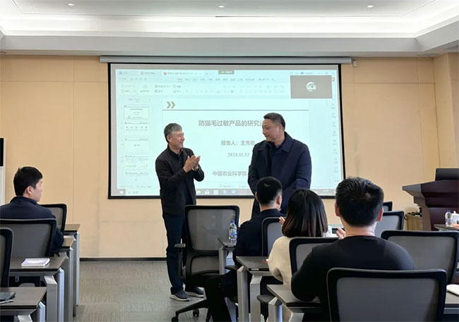 会议伊始,双方围绕“宠物营养与食品创新”主题,开展交流座谈。王秀敏研究员、韩冰副研究员、王振龙博士,分别就“抗猫毛过敏产品的研究进展”“益生菌、益生元与犬猫健康”“基于宏基因组学的人宠间抗生素抗性基因传递的风险研究”等课题与中宠股份科研团队进行了交流分享。