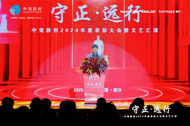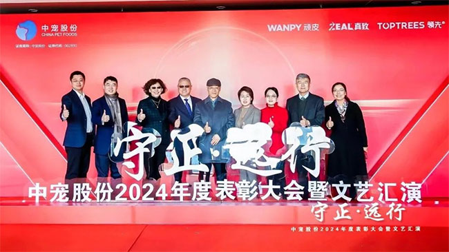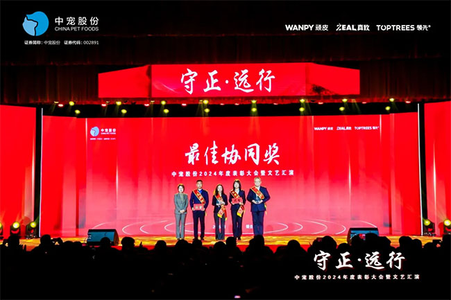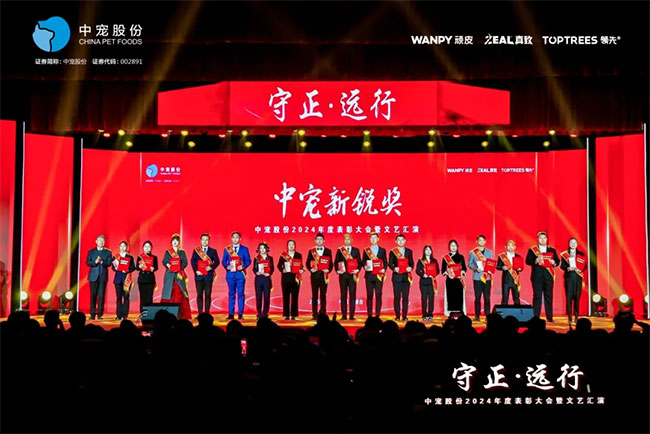 在这充满荣耀与激情的时刻,我们齐聚一堂,共同见证那些在2024年里为中宠股份做出卓越贡献的个人与团队。他们在各自的岗位上拼搏奋进,用实际行动诠释着责任与担当,推动公司不断迈向新高峰,书写着属于中宠股份的辉煌篇章。董事长特别表彰奖的卓越经营贡献;最佳销售团队的攻坚克难、披荆斩棘;中宠新锐奖获得者的奋发进取与朝气蓬勃;海外开拓先锋的勇毅担当;金牌销售奖的奋发与卓越;满勤永续的坚韧与执着;最佳支持团队的默默奉献与坚实后盾;最佳协同奖与最佳项目奖的团队协作与创新突破……他们共同书写了中宠股份27年的辉煌历史,以实际行动传承和弘扬着中宠股份的企业文化,用无畏与拼搏展现着中宠股份品牌的精神力量!