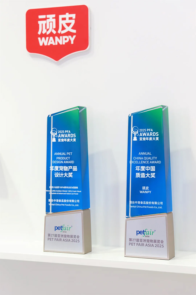 本次展会,WANPY顽皮®凭借深厚积淀与卓越实力一举斩获两项大奖。作为中国宠物食品出口第一品牌,WANPY顽皮®以全球市场的广泛认可与硬核地位,摘得中国质造大奖,彰显中国品牌国际竞争力。旗下顽皮小金盾 100% 鲜肉全价成猫粮,凭借 100% 真鲜肉工艺、全球级智造背书,以及黑金设计,荣获年度宠物产品设计大奖。