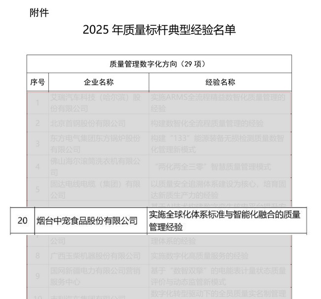 近日,中国质量协会公布“2025年质量标杆典型经验”名单,中宠股份凭借实施"全球化体系标准与智能化融合的质量管理经验"成功入选,是中国宠物行业第一家以及唯一一家获得国家级质量标杆称号的企业。